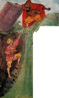 Depiction by British illustrator René Bull of Aladdin finding the magical lamp inside the cave, c.1898