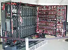 In July 1942, Turing devised a technique termed Turingery (or jokingly Turingismus[118]) for use against the Lorenz cipher messages produced by the Germans' new Geheimschreiber (secret writer) machine. This was a teleprinter rotor cipher attachment codenamed Tunny at Bletchley Park. Turingery was a method of wheel-breaking, i.e., a procedure for working out the cam settings of Tunny's wheels.[119] He also introduced the Tunny team to Tommy Flowers who, under the guidance of Max Newman, went on to build the Colossus computer, the world's first programmable digital electronic computer, which replaced a simpler prior machine (the Heath Robinson), and whose superior speed allowed the statistical decryption techniques to be applied usefully to the messages.[120] Some have mistakenly said that Turing was a key figure in the design of the Colossus computer. Turingery and the statistical approach of Banburismus undoubtedly fed into the thinking about cryptanalysis of the Lorenz cipher,[121][122] but he was not directly involved in the Colossus development.[123]