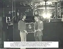 Tim Monnig presenting Alan w gold record for 'I Love the Nightlife (Disco Round)'