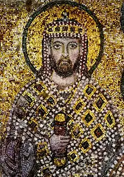 Mosaic of Emperor Alexander in Hagia Sophia. In his left hand he holds a globus cruciger, and in his right the akakia.
