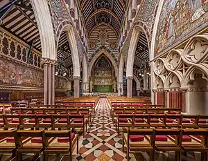 All Saints is particularly celebrated for its interior decoration. Every surface is richly patterned or decorated; the floor in diaper patterned tiles, wall surfaces in geometrical patterned brick, tile, and marble, as well as tiles with painted decoration, large friezes executed in painted tiles, a painted ceiling, and painted and gilded timberwork behind the altar. The architectural historian Nikolaus Pevsner described the interior as "dazzling, though in an eminently High Victorian ostentatiousness or obtrusiveness. ... No part of the walls is left undecorated. From everywhere the praise of the Lord is drummed into you."[14]