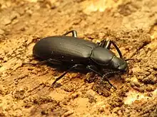 Alobates (Motschulsky 1872) is a genus of darkling beetles in the family Tenebrionidae. The name likely comes from Greek 'alo' (variant of allo) meaning 'other', and 'bates' meaning 'one who treads/haunts'. There are at least two described species in Alobates.[1][2][3] These species are often misidentified, but can be differentiated by a view of the mentum of the head ventral. A. barbatus have a tuft of long yellow setae, while A. pensylvanicus does not.
