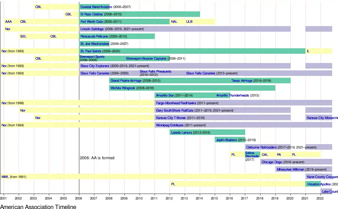 The American Association was founded in October 2005 when the St. Paul Saints, Lincoln Saltdogs, Sioux City Explorers, and Sioux Falls Canaries announced they were leaving the Northern League. Around the same time, the Central Baseball League announced it was disbanding after four seasons. The Fort Worth Cats, Shreveport-Bossier Sports, Pensacola Pelicans, Coastal Bend Aviators, and El Paso Diablos joined the four former Northern League teams and the expansion St. Joe Blacksnakes to form the American Association as a ten-team league. The new league began play in 2006, with a 96-game schedule, which has since expanded to 100 games.
