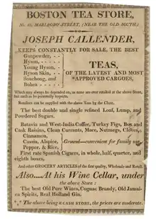 Advertisement of a Boston tea shop in 1811 listing teas for sale