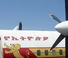 The Ethiopic (or Ge'ez) writing system is visible on the side of this Ethiopian Airlines Fokker 50: it reads "Ethiopia's": የኢትዮጵያ ye-ʾityop̣p̣ya.