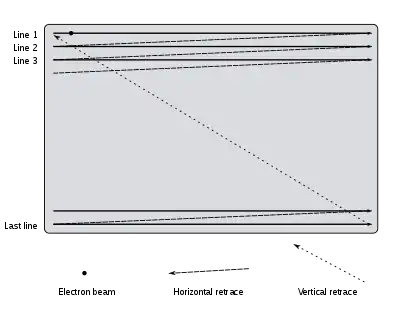 A cathode-ray tube (CRT) television displays an image by scanning a beam of electrons across the screen in a pattern of horizontal lines known as a raster. At the end of each line, the beam returns to the start of the next line; at the end of the last line, the beam returns to the beginning of the first line at the top of the screen. As it passes each point, the intensity of the beam is varied, varying the luminance of that point. A color television system is similar except there are three beams that scan together and an additional signal known as chrominance controls the color of the spot.