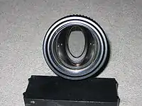 The aperture of the lens (the entrance pupil), as seen from the front, appears as an oval.