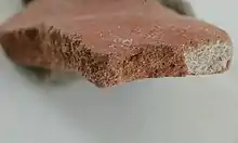 Nile clay is the result of eroded material in the Ethiopian mountains, which was transported into Egypt by the Nile. This clay was deposited on the banks of the Nile in Egypt since the Late Pleistocene by the cyclic Nile floods. As a result, deposits can be found far from the modern floodplain as well as within the level covered by the flood in modern times. Chemically, the clay is characterised by high silicon content and a high level of iron oxide. Mineralogically, it is micacaeous, illite-rich sediment clay, containing many different sand and stone particles brought from the various contexts through which the Nile flows.[2][3] The clay turns a red or brown colour when it is fired in an oxygen-rich oven. When unfired, it varies in colour from grey to nearly black.[4]
