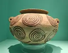 During the Chalcolithic, the rotating pilaster came into use for the manufacture of ceramics. This may have arisen from the desire to make the body and especially the opening of the vessel being made symmetrical. The technique can be clearly recognised from a horizontal rotation mark in the opening of the vessel.[16] Unlike the potter's wheel, there was no fixed axis around which rotations were centred.[20]
