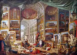 In 1749, Giovanni Pannini painted the Gallery of Cardinal Silvio Valenti-Gonzaga, a painting representing Silvio Valenti-Gonzaga inside a huge gallery whose walls are covered with reproductions of the paintings he owns.[5] This composition, featuring an imaginary architecture dedicated to the exhibition of an artistic collection, is the basis of the Gallery of Views.[6]