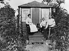 Anna Åbergsson was introduced to allotment gardening through her friend, the social democratic politician and social reformer Anna Lindhagen. Lindhagen had first encountered allotment gardens in Copenhagen in 1903 and was immediately taken by the health-related benefits that the small garden compounds offered urban working-class families who at the time often suffered from squalor living conditions, a lack of fresh air and poor nutrition. In 1906 Åbergsson and Lindhagen initiated the establishment of Sweden's first association for allotment gardens, Föreningen koloniträdgårdar in Stockholm (today Föreningen Stor-Stockholms Koloniträdgårdar, FSSK); Lindhagen becoming director and Åbergsson financial accountant. When Stockholm municipality in 1921 took over the management of the garden colony, Åbergsson took over the position of director from her friend.[8] By 1918 she had also become the accountant for Frisinnade landsföreningen (National Association of the Liberal-Minded), was secretary of Folkhushållningskommissionens koloniavdelning (the Department for Allotment Gardening of the Public Housekeeping Commission) and together with a group of fellow allotment gardeners had founded Odlingssällskapet Stockholms Omnejd (Cultivation Society Stockholm’s Region) with the gardening colony Bergshamra, for which she continued to work until her death in 1937.[9]