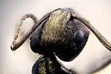 An ant's head contains many sensory organs. Like most insects, ants have compound eyes made from numerous tiny lenses attached together. Ant eyes are good for acute movement detection, but do not offer a high resolution image. They also have three small ocelli (simple eyes) on the top of the head that detect light levels and polarization.[39] Compared to vertebrates, ants tend to have blurrier eyesight, particularly in smaller species,[40] and a few subterranean taxa are completely blind.[2] However, some ants, such as Australia's bulldog ant, have excellent vision and are capable of discriminating the distance and size of objects moving nearly a meter away.[41]