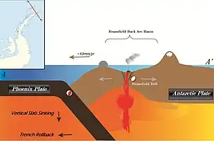 There are various volcanoes in the islands around the Antarctic Peninsula. This volcanism is related to extensional tectonics in Bransfield Rift to the west and Larsen Rift to the east.[16]