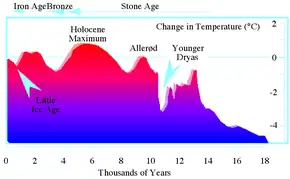 The deglaciation of the Antarctic Peninsula largely occurred between 18,000 and 6,000 years ago as an interglacial climate was established in the region. It initially started about 18,000 to 14,000 years ago with retreat of the ice sheet from the Pacific outer continental shelf and the continental margin within the Weddell Sea. Within the Weddell Sea, the transition from grounded ice to a floating ice shelf occurred about 10,000 years ago. The deglaciation of some locations within the Antarctic Peninsula continued until 4,000 to 3,000 years ago. Within the Antarctic Peninsula, an interglacial climatic optimum occurred about 3,000 to 5,000 years ago. After the climate optimum, a distinct climate cooling, which lasted until historic times, occurred.[23][24][27][28]