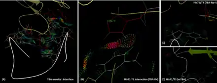 The nucleotides G23, T24, G25, A26, C27 in the duplex and T9, T18, T19, G20 in G-quadruplex contribute to the interaction with the exosite II of thrombin. On the protein side, the residues Tyr89, His91, Pro92, Arg93, Tyr94, Asn95, Trp96, Arg97, Arg126, Leu130, Arg165, Lys169, His230, Arg233, Trp237, Val241 and Phe245 in thrombin are involved in the interaction. Since the exosite II is a positively charged motif, it creates many ion pairs with the HD22 backbone especially in the duplex region. Hydrophobic interactions are mainly observed in the G-quadruplex region (T9, T18 and T10), and this stabilizes the complex formation. Moreover, Interacting with thrombin improves the thermal stability of HD22 structure, and results in the increase of melting temperature (from 36 to 48 °C).[19] Calculated binding energy of HD22 to thrombin exosite II is -88.37 -kcal.mol-1.[14]