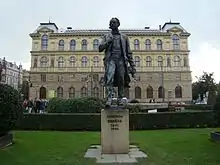 In 1897 Dvořák's daughter Otilie married his student, the composer Josef Suk. In the same year, Dvořák visited Brahms on his deathbed and attended his funeral on 6 April 1897.[96] In November Dvořák was appointed a member of the jury for the Viennese Artists' Stipendium.[97][98] He was informed in November 1898 that Emperor Franz Joseph I of Austria-Hungary would award him a gold medal for Litteris et Artibus, the ceremony taking place before an audience in June 1899.[99] On 4 April 1900 Dvořák conducted his last concert with the Czech Philharmonic, performing Brahms' Tragic Overture, Schubert's "Unfinished" Symphony, Beethoven's 8th Symphony, and Dvořák's own symphonic poem The Wild Dove.[98] In April 1901, The Emperor appointed him a member of the Austrian House of Lords, along with the leading Czech poet Jaroslav Vrchlický.[lower-alpha 4] Dvořák also succeeded Antonín Bennewitz as director of the Prague Conservatory from November 1901 until his death.[101] Dvořák's 60th birthday was celebrated as a national event. First, around the actual date, six of his operas and the oratorio St. Ludmila were performed in Prague, but Dvořák was away in Vienna; then in November 1901 came the "postponed official birthday party... In many towns all over Bohemia and Moravia, the Czech people celebrated his birthday."[102]