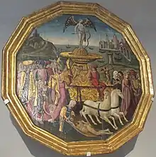He was born in Florence and is also known as the "Master of the Jarves Cassone".[1] Apollonio di Giovanni was recorded in Florence 1446 where he ran a workshop specialised in producing wedding chests known as cassoni and other such furniture. He died in 1465.[2] He worked in partnership with the woodworker Marco del Buono Giamberti, whose son became Apollonio's pupil and heir.