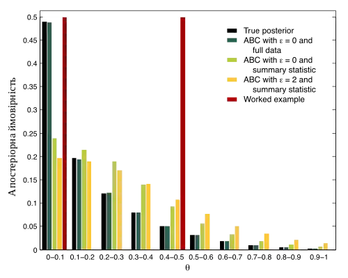 Although Diggle and Gratton's approach had opened a new frontier, their method was not yet exactly identical to what is now known as ABC, as it aimed at approximating the likelihood rather than the posterior distribution. An article of Simon Tavaré and co-authors was first to propose an ABC algorithm for posterior inference.[7] In their seminal work, inference about the genealogy of DNA sequence data was considered, and in particular the problem of deciding the posterior distribution of the time to the most recent common ancestor of the sampled individuals. Such inference is analytically intractable for many demographic models, but the authors presented ways of simulating coalescent trees under the putative models. A sample from the posterior of model parameters was obtained by accepting/rejecting proposals based on comparing the number of segregating sites in the synthetic and real data. This work was followed by an applied study on modeling the variation in human Y chromosome by Jonathan K. Pritchard and co-authors using the ABC method.[8] Finally, the term approximate Bayesian computation was established by Mark Beaumont and co-authors,[9] extending further the ABC methodology and discussing the suitability of the ABC-approach more specifically for problems in population genetics. Since then, ABC has spread to applications outside population genetics, such as systems biology, epidemiology, and phylogeography.