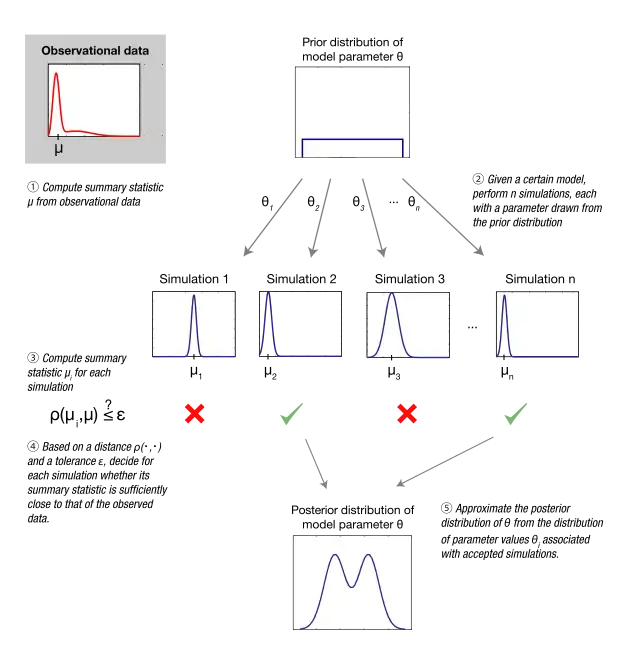 This article was adapted from the following source under a CC BY 4.0 license (2013) (reviewer reports): Mikael Sunnåker; Alberto Giovanni Busetto; Elina Numminen; Jukka Corander; Matthieu Foll; Christophe Dessimoz (2013). "Approximate Bayesian computation". PLOS Computational Biology. 9 (1): e1002803. doi:10.1371/JOURNAL.PCBI.1002803. ISSN 1553-734X. PMC 3547661. PMID 23341757. Wikidata Q4781761.{{cite journal}}: CS1 maint: unflagged free DOI (link)