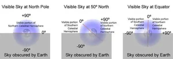 To calculate what astronomical features a structure faced a coordinate system is needed. The stars provide such a system. On a clear night observe the stars spinning around the celestial pole can be observed. This point is +90° of the North Celestial Pole or −90° observing the Southern Celestial Pole.[117] The concentric circles the stars trace out are lines of celestial latitude, known as declination. The arc connecting the points on the horizon due East and due West (if the horizon is flat) and all points midway between the Celestial Poles is the Celestial Equator which has a declination of 0°. The visible declinations vary depending where you are on the globe. Only an observer on the North Pole of Earth would be unable to see any stars from the Southern Celestial Hemisphere at night (see diagram below). Once a declination has been found for the point on the horizon that a building faces it is then possible to say whether a specific body can be seen in that direction.