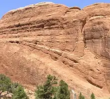 Geological processes that occurred over 300 million years ago caused a salt bed to be deposited, which today lies beneath the landscape of Arches National Park.[12] Over time, the salt bed was covered with sediments that eventually compressed into rock layers that have since been named Entrada Sandstone. Rock layers surrounding the edge of the salt bed continued to erode and shift into vertical sandstone walls called fins. Sand collected between vertical walls of the fins, then slightly acidic rain combined with carbon dioxide in the air allowed for the chemical formation of carbonic acid within the trapped sand. Over time, the carbonic acid dissolved the calcium carbonate that held the sandstone together.[13] Many of the rock formations have weaker layers of rock on bottom that are holding stronger layers on top. The weaker layers would dissolve first, creating openings in the rock. Gravity caused pieces of the stronger rock layer to fall piece by piece into an arch shape. Arches form within rock fins at points of intense fracturing localization, or weak points in the rock's formation, caused by horizontal and vertical discontinuities.[14] Lastly, water, wind, and time continued this erosion process and ultimately created the arches of Arches National Park.[13] All of the arches in the park are made of Entrada Sandstone, however, there are slight differences in how each arch was developed. Entrada Sandstone is categorized into three groups: Slick rock members, Dewey rock members, and Moab members.[15] Vertical arches can be developed from Slick rock members, a combination of Slick rock members and Moab members, or Slick rock members resting above Dewey rock members. Horizontal arches (also called potholes) are formed when a vertical pothole formation meets a horizontal cave, causing a union into a long arch structure. The erosion process within Arches National Park will continue as time continues to pass. Continued erosion combined with vertical and horizontal stress will eventually cause arches to collapse, but still, new arches will continue to form for thousands of years.[16]