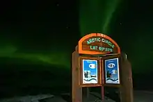 The position of the Arctic Circle is not fixed and currently runs 66°33′49.8″ north of the Equator.[5] Its latitude depends on the Earth's axial tilt, which fluctuates within a margin of more than 2° over a 41,000-year period, owing to tidal forces resulting from the orbit of the Moon.[6] Consequently, the Arctic Circle is currently drifting northwards at a speed of about 14.5 m (48 ft) per year.
