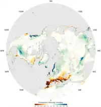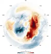 The Arctic oscillation (AO) or Northern Annular Mode/Northern Hemisphere Annular Mode (NAM) is a weather phenomenon at the Arctic pole north of 20 degrees latitude. It is an important mode of climate variability for the Northern Hemisphere. The southern hemisphere analogue is called the Antarctic oscillation or Southern Annular Mode (SAM). The index varies over time with no particular periodicity, and is characterized by non-seasonal sea-level pressure anomalies of one sign in the Arctic, balanced by anomalies of opposite sign centered at about 37–45° N.[1]