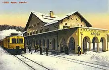 Also in 2013, the Äber (in Swiss German; Eber in German) gallery was demolished above Sassal and replaced by rockfall nets.[26] In time for the 100th anniversary of the Arosa Railway, Arosa station was rebuilt with work completed in December 2014 at a cost of more than CHF 24 million. The extensive modernisation was carried out in cooperation by the RhB, the canton of the Grisons, the municipality of Arosa and Arosa Bergbahnen AG.[27][28]