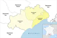 In 1800 the arrondissements of Montpellier, Béziers, Lodève and Saint-Pons were established. The arrondissements of Lodève and Saint-Pons were disbanded in 1926, and Lodève was restored in 1942.[3] In 2009 the arrondissement of Montpellier lost the three cantons of Aniane, Ganges and Saint-Martin-de-Londres to the arrondissement of Lodève.[4]