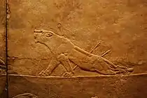 Campaigns focus on the progress of the army, including the fording of rivers, and usually culminates in the siege of a city, followed by the surrender and paying of tribute, and the return of the army home. A full and characteristic set shows the campaign leading up to the siege of Lachish in 701; it is the "finest" from the reign of Sennacherib, from his palace at Nineveh and now in the British Museum.[16] Ernst Gombrich observed that none of the many casualties ever come from the Assyrian side.[17] Another famous sequence there shows the Lion Hunt of Ashurbanipal, in fact the staged and ritualized killing by King Ashurbanipal of lions already captured and released into an arena, from the North Palace at Nineveh. The realism of the lions has always been praised, and the scenes are often regarded as "the supreme masterpieces of Assyrian art", although the pathos modern viewers tend to feel was perhaps not part of the Assyrian response.[18]
