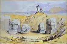 Layard returned to England in June 1847, also taking Rassam, who he had arranged to study at Cambridge. He left a few workers, mainly to keep other diggers off the sites, as the French were digging again. His finds were arriving in London, to great public interest, which he greatly increased by publishing a string of books, especially Nineveh and its Remains in 1849. The mistaken title arose because Henry Rawlinson had at that point become convinced that the Nimrud site was actually the ancient Nineveh, though he changed his mind soon after.[64] By October 1849 Layard was back in Mosul, accompanied by the artist Frederick Cooper, and continued to dig until April 1851, after which Rassam took charge of the excavations.[65] By this stage, thanks to Rawlinson and other linguists working on the tablets and inscriptions brought back and other material, the Assyrian cuneiform was at the least becoming partly understood,[66] a task that progressed well over the next decade.