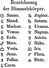 71. 1 2 Gauss, Carl Friedrich; Schumacher, Heinrich Christian (1865). Peters, Christian Friedrich August (ed.). Briefwechsel zwischen C. F. Gauss und H. C. Schumacher (in German). p. 115. Wenn noch mehrere von dieser Planetenfamilie entdeckt werden, so möchte es am Ende schwer halten, neue geeignete Zeichen aufzufinden, auch kann man doch eigentlich nicht von einem Atronomen verlangen, dass er Blumen- und Figurenzeichner seyn soll. Ich glaube es wäre weit bequemer, alle mit einem Kreise, der die Ordnungszahl ihrer Endeckung enthält, zu bezeichnen: Ceres mit ① Victoria mit ⑫ u. s. w. Man kommt dann nie in Verlegenheit. Es mögen so viele, wie man will, entdeckt werden, das Zeichen ist im voraus bestimmt. Alle diese Zeichen sind leicht zu schreiben, und sehen im Drucke gut aus, auch zeigt der letzte immer wie viele von der Brut da sind. Ich würde, wenn ich nicht einen grossen Abscheu vor allen nicht absolut nothwendigen Neuerungen hätte, den Vorschlag in den A. N. [Astronomische Nachrichten] machen.