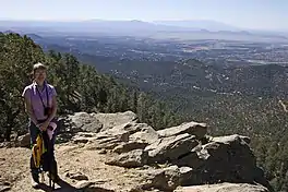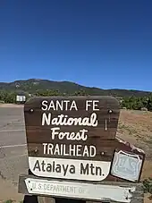 Atalaya Mountain is a mountain peak located within the Santa Fe National Forest, in northern New Mexico, United States. It is part of the Santa Fe Mountains in the Sangre de Cristo Range, a subrange of the Southern Rocky Mountains. A relevant viewscape from the city of Santa Fe, there are no higher peaks between the city and Atalaya Mountain to the east. Viewed from the city, Atalaya Mountain is framed by Sun Mountain to the right (south), Picacho Peak to the left (north), and Thompson Peak behind it. Atalaya Mountain is accessible by following the Atalaya Trail,[2] or via the Dale Ball Trails from the direction of Picacho Peak and trail marker number 36.