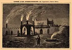 The Englishman Ussher visited Ateshgah on September 19, 1863. He calls it "Atash Jah" and said that there are pilgrims from India and Persia.[40] German Baron Max Thielmann visited the temple in October 1872 and in his memoirs he wrote that Parsi community of Bombay sent here a priest who after a few years will be replaced. His presence is necessary, because here come the pilgrims from the outskirts of Persia (Yazd, Kerman) and from India and remain in this sacred place for several months or years.[41]
