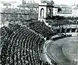 Winning the domestic league also granted Athletic entry to the European Cup, the first edition of which had been won by Spanish rivals Real Madrid.[13] During the 1956–57 campaign,[14] They defeated FC Porto in the opening round and were then drawn against Budapest Honvéd of Hungary at a significant point in that nation's history.[15][16][17] Before the first leg of their tie – originally scheduled for Budapest – had been played, the Hungarian Revolution of 1956 began. The Honvéd players, who formed the backbone of the 'Mighty Magyars' international side, were already out of the country, but their families remained at home amidst the chaos of the uprising. The legs were switched, with Athletic winning narrowly 3–2 in Bilbao.[15][16][17]