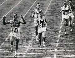 ![]() Billy Mills crossing the finish line in the 10,000 metres at the 1964 Olympic Games. | |