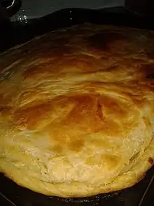 Börek[1][2] or burek is a family of pastries or pies found in the Balkans, Middle East and Central Asia. The pastry is made of a thin flaky dough such as filo with a variety of fillings, such as meat, cheese, spinach, or potatoes. Boreks are mainly associated with the Middle East, Armenia, and also with the former Ottoman Empire, including the Balkans and the South Caucasus, Eastern European and Central European countries, Northern Africa and Central Asia. A borek may be prepared in a large pan and cut into portions after baking, or as individual pastries. They are usually baked but some varieties can be fried. Borek is sometimes sprinkled with sesame or nigella seeds, and it can be served hot or cold.