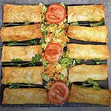 | Sigara böreği | Filo rolls, lit. 'cigarette börek' | Feta cheese, wiener, potato or other filling wrapped in yufka filo and deep-fried | [22] |