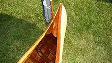 Stem Morris canoes display a “splayed stem”, 3 inches or so in width at the inboard end and made of cedar. The splayed end of the stem has a squared-off appearance. Some canoes built by the Kennebec Boat and Canoe Company have an identical cedar stem, possibly because Kennebec founder George Terry hired men from Morris.[12] The Rhinelander Boat Company employed a splayed hardwood stem on its boats as well as its canoes.