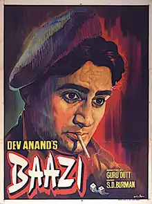 Baazi (English: Gamble) is a 1 July 1951 Indian Hindi noir film directed by Guru Dutt. This was the second film of Dev Anand's production house Navketan Films, and as per a commitment given by Dev Anand to Guru Dutt in their days of struggle, the movie was given to Dutt for direction. Baazi was the first crime noir made in the country. It initiated a new genre called "Bombay Noir", the success of which encouraged and defined the later noir films of 1950s and '60s in Hindi cinema.[1] It was the first film in which Dev Anand came up with his unique style of rapid-fire. The film's story was partly inspired by the 1946 movie Gilda.[2][3]