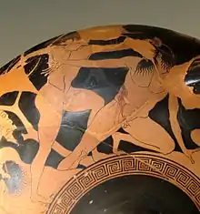 Ode 13 of the Bacchylides is a Nemean ode performed to honor the athlete Pytheas of Aegina for winning the pancration event of the Nemean games. Bacchylides begins his ode with the tale of Heracles fighting the Nemean lion, employing the battle to explain why pancration tournaments are now held during the Nemean games. The allusion to Heracles’ fight with the lion is also meant to incite why it is that Pytheas fights for the wreaths of the games: to obtain the undying glory that the heroes of old now possess for their deeds. Bacchylides then sings the praises of Pytheas' home, the island Aegina, and how "her fame excites a dancer’s praise."[82] Bacchylides continues this dancer allusion in praise of Aegina, and ends it by listing some famous men who were born on the island, namely Peleus and Telamon. Bacchylides then tells of the greatness of these men’s sons, Achilles and Ajax, alluding to a second myth, the tale of Ajax repelling Hector on the beaches of Troy, keeping the Trojans from burning the Greek ships. Bacchylides relates how Achilles’ inaction spurred the Trojans to false hope, and how their swollen pride led them to be destroyed at the hands of the men they thought they had vanquished. The ode plays upon the fact that those who are listening to Bacchylides have also read the epics of Homer, and understand the whole story behind this scene that would speak poorly of Achilles if people did not know the role he played in the Trojan war. With this tale complete Bacchylides proclaims once again that the actions he has just told will be forever remembered thanks to the muses, leading once again into his praise of Pytheas and his trainer Menander, who shall be remembered for their great victories in the Pan-Hellenic games, even if an envious rival slights them.[82][83]