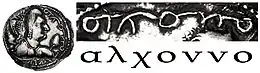 The word "Alchono" (αλχοννο) in cursive Bactrian script, on a coin of the Alchon Huns ruler Khingila, 5th century AD.[12][13][14]