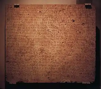 The Surkh Kotal inscription (SK4) is the first known substantial document written in Bactrian, an Iranian language. It uses the Greek script. It was written at the time of the Kushan ruler Huvishka, 2nd century CE. Kabul Museum.[18]