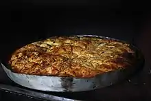 According to a number of scholars, koptoplakous (κοπτοπλακοῦς) was a precursor to the modern baklava.[22][37][38] Historian Speros Vryonis describes koptoplakous as a "Byzantine favorite" and "the same as the Turkish baklava",[39] as do other writers.[34] The name (Greek: πλατσέντα) is used today on the island of Lesbos for thin layered pastry leaves with crushed nuts, baked, and covered in syrup.[40][41]