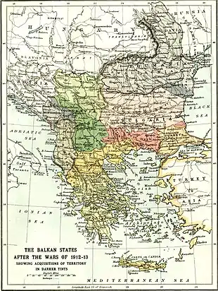 The Balkans had been in a state of turmoil since the early 1900s, with years of guerrilla warfare in Macedonia followed by the Young Turk Revolution, the protracted Bosnian Crisis, and several Albanian Uprisings. The outbreak of the Italo-Turkish War in 1911 had further weakened the Ottomans and emboldened the Balkan states. Under Russian influence, Serbia and Bulgaria settled their differences and signed an alliance, originally directed against Austria-Hungary on 13 March 1912,[2] but by adding a secret chapter to it essentially redirected the alliance against the Ottoman Empire.[3] Serbia then signed a mutual alliance with Montenegro, while Bulgaria did the same with Greece. The League was victorious in the First Balkan War which broke out in October 1912, where it successfully seized control of almost all European Ottoman territories. Following this victory however, unresolved prior differences between the allies re-emerged over the division of the spoils, particularly Macedonia, leading to the effective break-up of the League, and soon after, on 16 June 1913, Bulgaria attacked her erstwhile allies, beginning the Second Balkan War.
