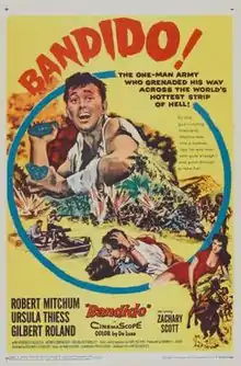 Bandido is a 1956 American western film directed by Richard Fleischer and starring Robert Mitchum, Ursula Thiess, Gilbert Roland, and Zachary Scott. The film, set in the Mexican Revolution and filmed on location around Acapulco, was written by Earl Felton. Robert Mitchum also co-produced the film through his DRM Productions company.[2]
