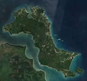 Bangka is an island lying east of Sumatra, Indonesia. It is administered under the province of the Bangka Belitung Islands, being one of its namesakes alongside the smaller island of Belitung across the Gaspar Strait. The 9th largest island in Indonesia,[1] it had a population of 1,146,581 at the 2020 census.[2] It is the location of the provincial capital of Pangkal Pinang, and is administratively divided into four regencies and a city. The island itself and the surrounding sea suffers considerable environmental damage from its thriving tin mining industry which operates on- and offshore.