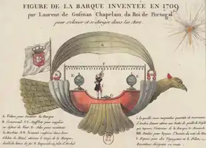 In 1709, he presented a petition to King João V of Portugal, seeking royal favour for his invention of an airship, in which he expressed the greatest confidence. The contents of this petition have been preserved, together with a picture and description of his airship. Developing the ideas of Francesco Lana de Terzi, S.J., Gusmão wanted to spread a huge sail over a boat-like body like the cover of a transport wagon; the boat itself was to contain tubes through which, when there was no wind, air would be blown into the sail by means of bellows. The vessel was to be propelled by the agency of magnets which were to be encased in two hollow metal balls. The public test of the machine, which was set for 24 June 1709, did not take place.