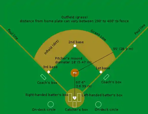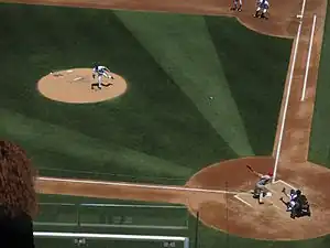 Similarly, there are no regulations at all concerning the dimensions of foul territory. Thus a foul fly ball may be entirely out of play in a park with little space between the foul lines and the stands, but a foulout in a park with more expansive foul ground.[131] A fence in foul territory that is close to the outfield line will tend to direct balls that strike it back toward the fielders, while one that is farther away may actually prompt more collisions, as outfielders run full speed to field balls deep in the corner. These variations can make the difference between a double and a triple or inside-the-park home run.[132] The surface of the field is also unregulated. While the adjacent image shows a traditional field surfacing arrangement (and the one used by virtually all MLB teams with naturally surfaced fields), teams are free to decide what areas will be grassed or bare.[133] Some fields—including several in MLB—use artificial turf. Surface variations can have a significant effect on how ground balls behave and are fielded as well as on baserunning. Similarly, the presence of a roof (seven major league teams play in stadiums with permanent or retractable roofs) can greatly affect how fly balls are played.[134] While football and soccer players deal with similar variations of field surface and stadium covering, the size and shape of their fields are much more standardized. The area out-of-bounds on a football or soccer field does not affect play the way foul territory in baseball does, so variations in that regard are largely insignificant.[135]