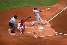 Play starts with a member of the batting team, the batter, standing in either of the two batter's boxes next to home plate, holding a bat.[12] The batter waits for the pitcher to throw a pitch (the ball) toward home plate, and attempts to hit the ball[13] with the bat.[12] The catcher catches pitches that the batter does not hit—as a result of either electing not to swing or failing to connect—and returns them to the pitcher. A batter who hits the ball into the field of play must drop the bat and begin running toward first base, at which point the player is referred to as a runner (or, until the play is over, a batter-runner). A batter-runner who reaches first base without being put out is said to be safe and is on base. A batter-runner may choose to remain at first base or attempt to advance to second base or even beyond—however far the player believes can be reached safely. A player who reaches base despite proper play by the fielders has recorded a hit. A player who reaches first base safely on a hit is credited with a single. If a player makes it to second base safely as a direct result of a hit, it is a double; third base, a triple. If the ball is hit in the air within the foul lines over the entire outfield (and outfield fence, if there is one), or if the batter-runner otherwise safely circles all the bases, it is a home run: the batter and any runners on base may all freely circle the bases, each scoring a run. This is the most desirable result for the batter. The ultimate and most desirable result possible for a batter would be to hit a home run while all three bases are occupied or "loaded", thus scoring four runs on a single hit. This is called a grand slam. A player who reaches base due to a fielding mistake is not credited with a hit—instead, the responsible fielder is charged with an error.[12]